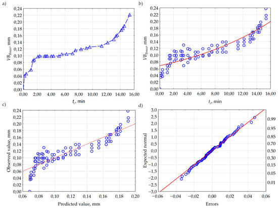 Based on the results obtained and the analysis of variance, it was concluded that, within the assumed range of variables under study, the developed model is adequate (F = 344.5687) and approximates the predictor variable, i.e., tool wear during cutting, with an accuracy of 90%. This is evidenced by a determination coefficient of R = 0.90. Furthermore, in the scatter plot (Figure 12c), the points lay along a straight line, indicating that the model is appropriate and that the residuals (i.e., errors) are subject to a normal distribution, which, in turn, is illustrated in Figure 12d.