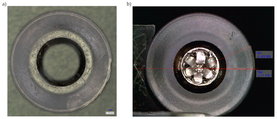 In order to be able to carry out an angle measurement, i.e., measure the angle of the blade in the base plane under given machining conditions, a reference line must first be marked. This line is applied to a round cutting insert. It passes through the center point of the RCI. In this way, when assembling the tool set (body with inserts), it is possible to position the insert for the first time in such a way that the reference line is parallel from the tool’s axis of rotation, as shown in Figure 13. As can be observed in Figure 13b, the marked trace of the cross-sectional effect of the cut layer on the cutting blade is completely within the limits of the cutting blade working angle.