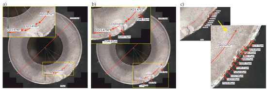 Analyzing the results obtained from the digital microscope measurement, it was found that all worn segments were within the cutting blade working angle (Figure 14a). This demonstrates the correctness of both the models developed and the procedure together with the measurement techniques used. These techniques made it possible to measure the maximum defect, that is, the abrasion of the blade material, as shown in Figure 14b. It was found that there were differences in the value of the maximum abrasion between the segments, which may be due to the radial runout of the cutting blade. In this case, further research and clarification of the proposed solution should be carried out. In addition, it was also possible to measure the distribution of clash variation relative to the nominal RCI outline, which, in turn, is shown in Figure 14c. Maximum abrasion values were obtained in the zone of maximum thickness of the cut layer acting on the cutting blade. And, in this case, further research is needed. In conclusion, it can be said that the proposed solution works well not only for angular positioning of the RCI but also for carrying out analysis on wear mechanisms.