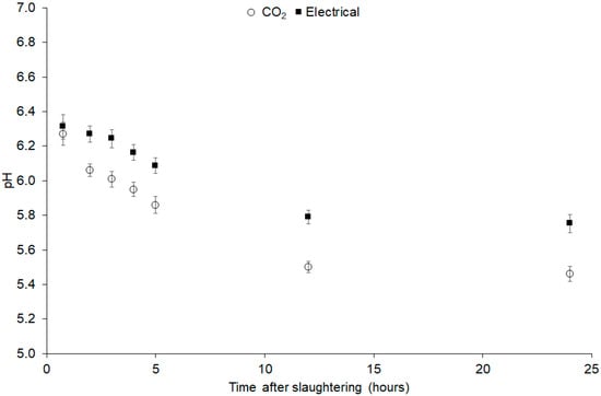 The hardness of muscles was characterized by penetration force and can be seen in Figure 5. In the first three hours post mortem, the penetration force of GM showed a decreasing tendency. Immediately after death and before the development of rigor mortis, muscles are pliable. Then, a slight increase in penetration force was observed for both stunning methods. This relates to the development of rigor mortis which is the major post mortem change in the muscle. There is no difference in the time course of the development of rigor mortis between stunning modes. In rigor mortis, muscle fibers are contracted due to ATP depletion which results in an increased hardness of muscles []. The penetration force of muscles reached the peak at Fp,electrical 45.13 N ± 1.97, and Fp,CO2 48.56 N ± 1.46 at four hours post mortem; then, at 24 h post mortem, decreased to Fp,CO2 40.01 N ± 0.63 and Fp,electrical 39.78 N ± 0.69. A previous study [] found that the Warner–Bratzler shear force of lamb m. longissimus dorsi increased at three hours post mortem and then decreased up to 72 h post mortem. Post mortem, a significant difference was not observed between electrically and CO2-stunned GM penetration force. During electrical and CO2 stunning of pigs, significant differences were also not found in Warner–Bratzler shear force on m. longissimus thoracis [].