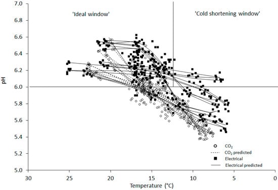 The change in pH as a function of temperature and the spline model predictions for the pH of CO2- and electrically stunned pork m. gluteus medius. The solid lines show the ‘ideal’ and ‘cold shortening’ windows.
