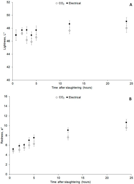 The initial L*CO2 46.96 ± 0.82 and L*electric 46.92 ± 0.81 were in the normal range (L* < 50) recommended by [] in both stunning methods (Figure 3A). A slight increase in L* was seen two hours post mortem, and then a decrease occurred until the fourth hour. After death, physicochemical, biochemical, and structural changes begin in the muscles. The major physicochemical change is the development of rigor mortis in which muscle contractions occur and its structure becomes compact. This increasingly compact structure results in less light dispersion on muscle surfaces and a less light appearance. Complete development of rigor mortis occurs at approx. 197 min in pigs [] which can be traced in the changing of the measured L* values. Post rigor, muscle increasingly relaxes and its lightness increases again. The GM of pigs stunned electrically showed significantly higher L* values compare to those submitted to CO2 stunning (p < 0.05). A similar significant relation was found in pig m. longissimus lumborum [], m. longissimus thoracis [], and lamb m. longissimus dorsi [].