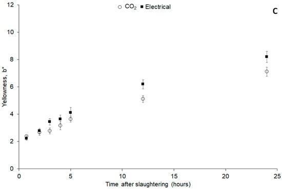 Using electrical stunning resulted in significantly higher a* values compared to using CO2 stunning (p < 0.05) (Figure 3B). Increasing redness post mortem is likely related to the oxygen consumption of muscle cells. After slaughter, mitochondria in the cells remain capable of consuming oxygen if substrates are available for their operation. However, post mortem, mitochondrial activity decreases due to the decreasing amount of substrates and this allows the formation of oxymyoglobin resulting in higher red color []. In the yellowness of GM, no significant difference was shown between electrical and CO2 stunning methods (Figure 3C).