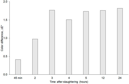 Changes in color difference over time can be seen in Figure 4. The ΔE* values showed an increasing tendency post mortem. Two hours post mortem, the color difference was <1 which means a standard observer does not notice the difference between CO2- and electrically stunned GM. After three hours post mortem, the color difference increased to the range of 1.5–2.0. From three hours post mortem, the color difference is already noticeable to an experienced observer. The decrease in ΔE* values can be seen at four hours post mortem which can be explained by a slight reduction in the differences between L* and b* values. This is associated with the development of rigor mortis. The contraction of muscle fibers in the meat results in a more compact structure. The contracted muscle fibers absorb more light and less light is reflected from them, resulting in a reduction in L* and b* differences.