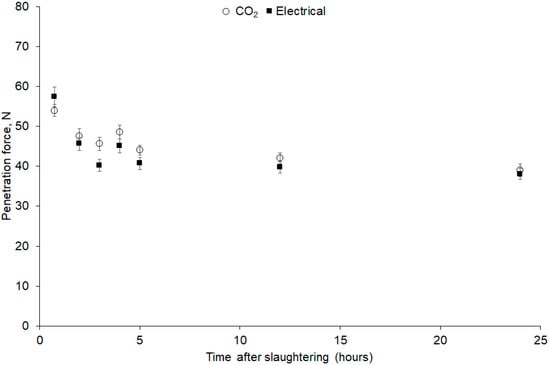 Changes in pork m. gluteus medius penetration force post mortem in the case of CO2 and electrical stunning. Data points present the averages and error bars show the standard errors.