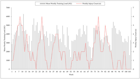 Mean weekly training load (AU) and weekly injury count (n) across the two-year observational period.