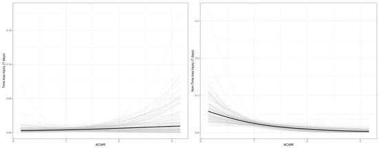 Spaghetti plots of the conditional effects of the relationships between injury types and Acute Chronic Workload Ratio (ACWR).