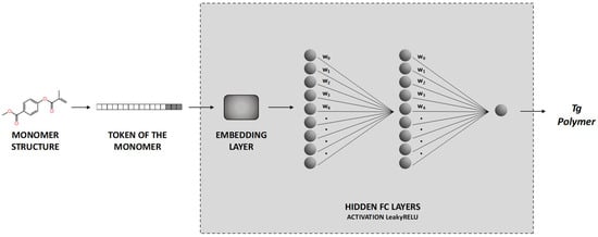 Our neural network architecture was designed to predict the Tg of polymers using tokenized SMILES strings. We employed both direct and a TL-based models to study prediction accuracy, particularly in situations where data is scarce. Figure 1 shows a schematic picture of the typical architecture of our direct models, where the shadowed area represents the “black box” in the neural network.