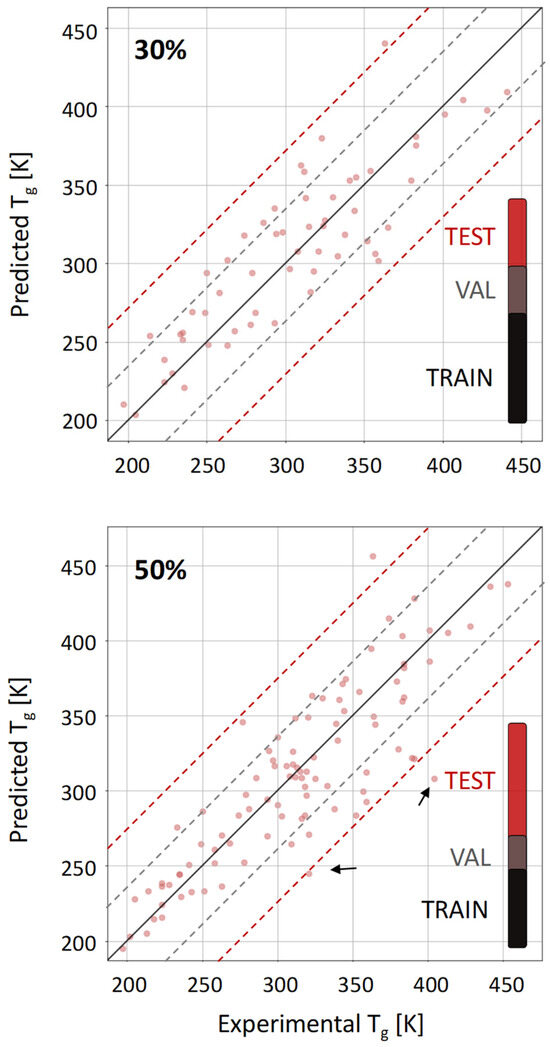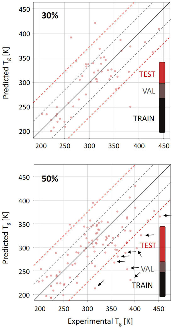 Predicted vs. experimental Tg plots for best performing direct model at each data scarcity scenario. (30%) train on 93 samples, validate on 41 samples and test on 58 samples, and (50%) train on 67 samples, validate on 29 samples and test on 93 samples. Dashed lines are just an arbitrary guide that indicate the 25 and 50K difference regions (grey and red, respectively). The black arrows indicate these samples where the model large deviations.