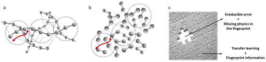 Figure 7a presents a schematic representation of these phenomena, where chemical groups are represented by balls connected by covalent bonds. The dashed circles indicate the characteristic length within which relaxation occurs (in turn illustrated by a red arrow), and the dashed blue lines represent the intermolecular forces at play. The neural network must implicitly learn the contributions of these various factors, which could be summarized as: (a) the chemical structure as encoded by the SMILES strings, (b) the stiffness, intramolecular forces and entanglement effects of the polymer chains, and (c) the intermolecular forces at play. In contrast, the glass transition process in molecular systems is not confined to a single polymer chain but occurs across multiple molecules, forming a sort of physical network (Figure 7b). As a result, chain stiffness and entanglements play a less significant role in these systems [43], and pre-trained models (which are based on molecular data) capture less information about these phenomena. Consequently, these aspects must be learned during the transfer learning process, provided that the fingerprint data allows for it. The puzzle in Figure 7c schematically represents the complete physics of the system (in this case the Tg in atactic polyacrylates above molecular weight saturation), with the missing piece representing the irreducible error (due to factors such as limited data, variations in measurement techniques, and errors in sample preparation) and the missing physical phenomena in the fingerprint (e.g., the above-mentioned polymer chain effects).