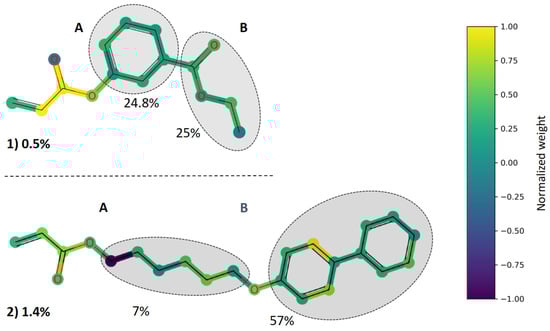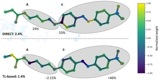 Conversely, analysing examples where the TL-based model exhibits low deviations can also shed light on its strengths and limitations. In the example shown in Figure 9, both models slightly overestimate the Tg, predicting values of 317 K (direct) and 314 K (TL-based), compared to the actual value of 310 K. Analysing their Shapley contributions, we observe that in scenarios involving larger side chains (where the side chain structure significantly influences the polymer’s Tg) the TL-based model shows improved performance. Specifically, the linear segment within the side chain (highlighted as A) decreases the predicted glass transition, as expected for a more mobile structure. On the other hand, the stiffer structure containing two phenyl groups (labelled as B) contributes to increasing the predicted Tg. Notably, this contribution to the Tg prediction is positive in both models, though it is twice as large in the direct model (53% of the total contributions, compared to 46% in the TL-based model). These results suggest that the TL-model may have a better “understanding” of the underlying physics when the side chain’s effect is significant, and therefore the scenario is more similar to the molecular glass former case.
