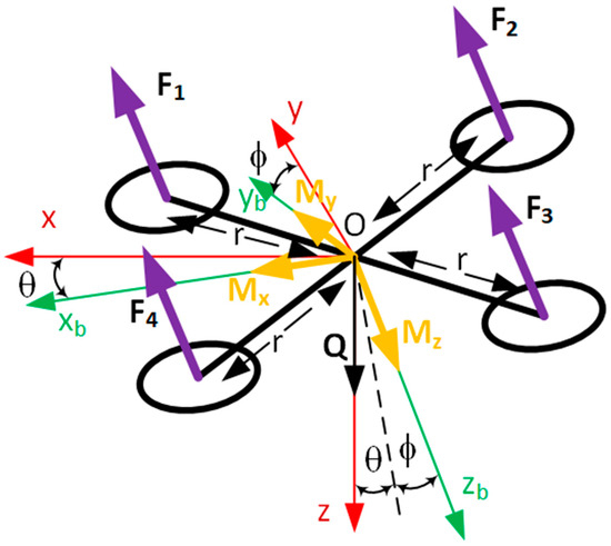 The quadrotor structure is presented in Figure 4, including the corresponding forces, torques, and orientation angles (pitch—θ, roll—ϕ, and yaw—ψ). Forces and torques are generated in the body frame (Oxbybzb) whereas the orientation angles are described as relations between the body frame and the Earth frame (Oxyz). The quadrotor has six degrees of freedom, so the movement of the quadrotor is rewritten by six equations (three translation motions and three rotation motions) [26].