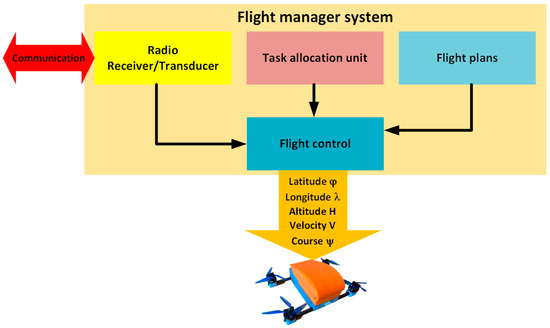 The FMS, from the flight plan, task allocation, and leader’s orders, creates the desired position, altitude, and velocity. Artificial intelligence algorithms are used to obtain flight parameters (Figure 6). This system is necessary when the UAV performs autonomous flight. The electronic equipment of a UAV is shown in Figure 7.