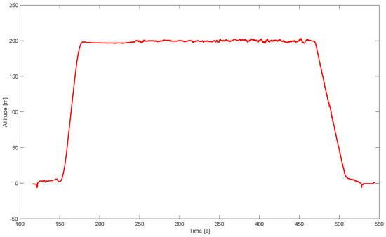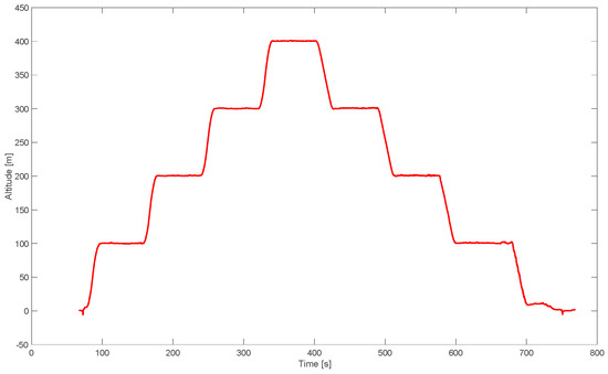 The platform was tested to confirm the desired parameters. Figure 3 shows the flying platform during tests. The tests were divided into two parts. The first test was focused on confirming vertical move parameters. There was a verified altitude and position stabilization. The flying platform had desired altitudes of 100, 200, 300, and 400 m (Figure 8). The measure was repeated to increase and decrease the altitude of the UAV. The speed was equal to 0 m/s (Figure 9), so the flying platform stabilized the position (longitude and latitude).