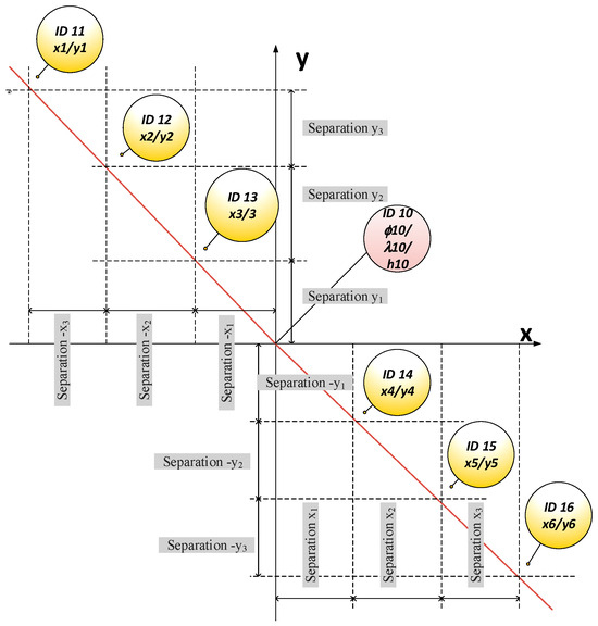 The primary task of maintaining the formation is to avoid collisions during the flight of unmanned aerial vehicles (UAVs). Coordinated UAV operation in the same airspace can lead to collisions; therefore, the formation provides separation between UAVs (Figure 9). The separation value is determined by both UAV motion parameters as well as the resolution and precision of navigation sensors. Maintaining separation ensures the safe operation of the formation. This is the main task of the formation control system. The formation commander sends information about the desired position of the formation. UAVs obtain new positions in the formation and move to a new location (UAVs consider information about the memorized separation—Figure 14).