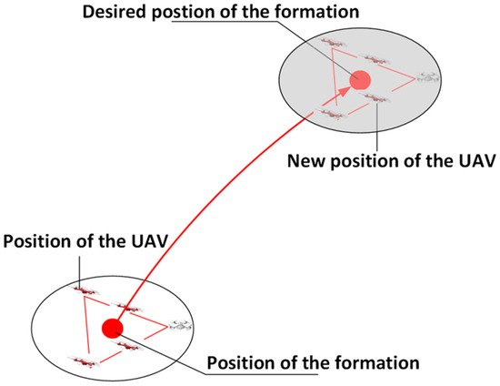 When the leader sends information about the new position of the formation (frequently, this is the position of the leader), all UAVs obtain the new desired position. After a command from the leader, the formation moves to the new position (Figure 15).