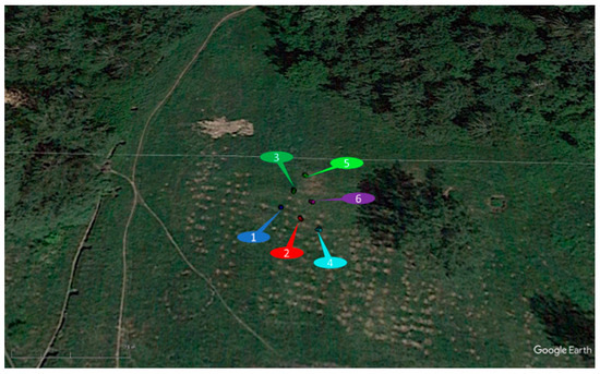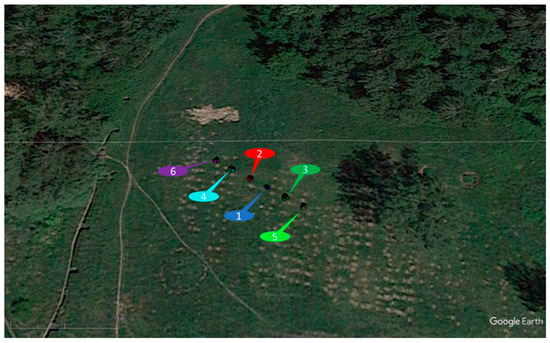 A line formation is shown in Figure 16. UAV number 1 in Figure 16 is the commander of the formation. The UAVs from numbers 2 to 6 are members of the formation. The triangle formation is depicted in Figure 17. The UAV IDs are the same as in the line formation. The formation commander (ID 1) has not changed position during the reconfiguration of UAVs from the line formation to the triangle formation.