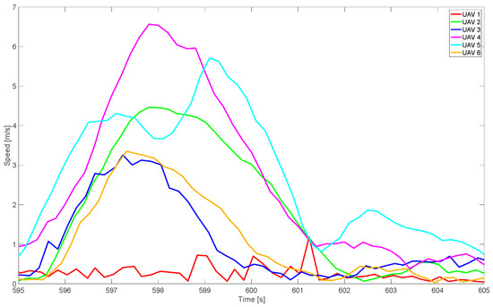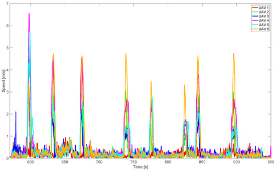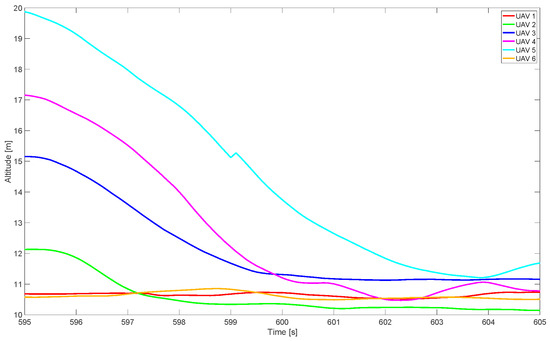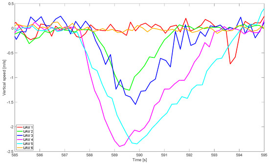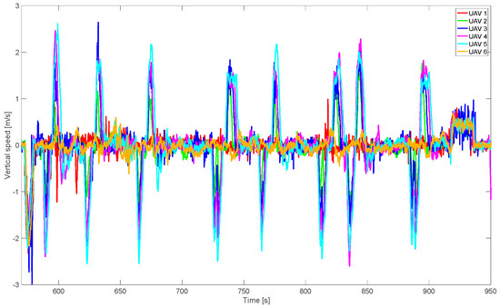 Figure 25 presents all altitude changes recorded during the verification tests. To alter the formation’s configuration, successive unmanned aerial vehicles were sent to different altitudes. For the sake of software simplification, the changes in altitude were associated with the individual drone numbers. The altitude change related to reconfiguration was calculated such that each drone increased its altitude by two meters relative to the previous one. For example, the UAV with ID 1 increased its altitude by 2 m while the UAV with ID 6 increased it by 10 m. The changes in vertical and horizontal speed recorded during the test are presented in Figure 26 and Figure 27.