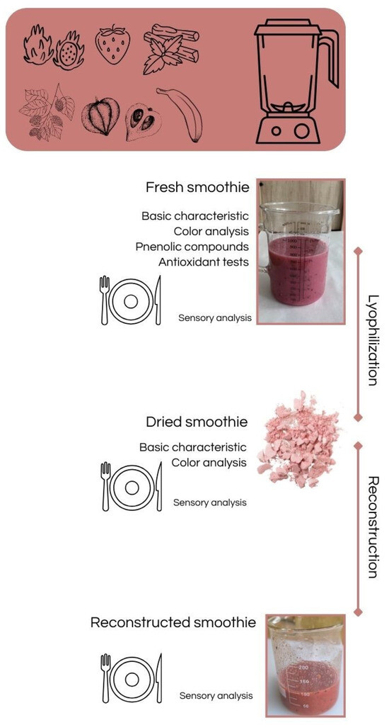 The preparation process started with cleaning and peeling the bananas, followed by dragon fruit solution (ratio 1.35:100) preparation. Next, other components were weighed according to the designed recipes (Table 1), and all components were mixed to obtain one homogeneous smoothie using a blender (Braun Multiquick 5 Pro, Neu-Isenburg, Germany).