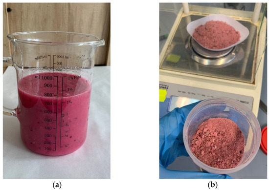 Lyophilization of the fresh samples was conducted by initially freezing the four variants at the temperature of −80 °C for 24 h using a freezer. Subsequently, the variants were transferred to a lyophilizer (freeze-dryer) (Christ Alpha 1-4 LSC, Osterode am Harz, Germany), where the vacuum was adjusted to sufficiently reduce the pressure, and the initial temperature was set at −50 °C. It took 96 h to achieve complete drying for all samples. In the final stage, the temperature was gradually increased to reach 25 °C to ensure the complete removal of water. Afterward, the smoothie powders were obtained, which were then ground and stored in airtight containers in a cool and dry place.