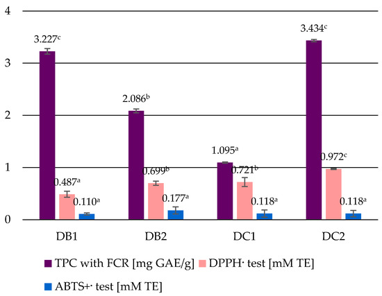 Antioxidant activity and total polyphenol content of the smoothies. a,b,c—different letters show statistically significant differences (p ≤ 0.05).