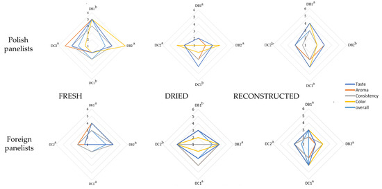 Sensory analysis of the fresh, dried, and reconstructed smoothies among Polish and foreign panelists. a,b—different letters show statistically significant differences in overall appearance between demographic groups (p ≤ 0.05).