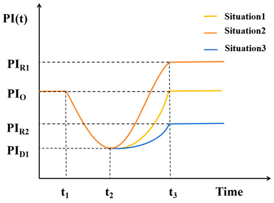Initial stage (t < t1): the normal operation phase of the project before it encounters a sudden event. In this phase, the project’s performance level P(t) remains at the initial level PIO.