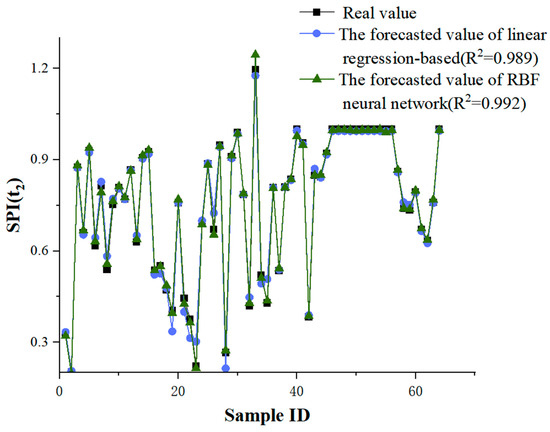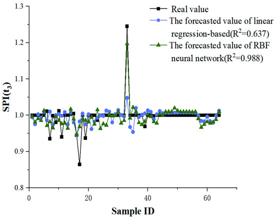 In order to verify the superiority of the model in this paper, a linear regression analysis was performed on the data from 64 projects. We use linear regression and the RBF neural network constructed in this paper to forecast SPI(t2) and SPI(t3) for 64 samples, respectively, and the forecasting results are shown in Figure 7 and Figure 8. The data obtained from the linear regression analysis are compared with the data obtained from the model constructed in this paper, as shown in Table 7. It can be seen that although the R2 of SPI(t2) obtained by linear regression is 0.989, which is extremely close to 1, the R2 of SPI(t3) is lower, which is only 0.637. This indicates that although the linear regression model has a better forecast effect on SPI(t2), the forecast effect of SPI(t3) is poorer.