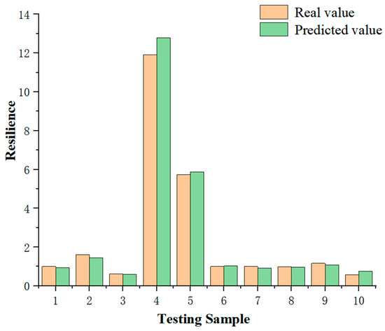 For the forecasted project performance results obtained, we assess the resilience of the project to the disruption E1 by means of the project resilience assessment model. Using sample 1 as an example, its project resilience level is calculated through Equation (3). It can be seen that the SPI is 1 before project 1 encounters a disruptive event, and at the moment of t2, the SPI drops to a minimum value of 0.7597, and finally, relying on the project’s own resilience and assessment, such as the reallocation of project resources, the SPI is restored to 1. According to Equation (3), the real resilience of project 1 is obtained as φreal-1 = 1. The forecast of project performance through the constructed network model yields the SPI (t2) forecasted result is 0.769 and the SPI (t3) forecasted result is 0.988. Calculated according to Equation (3), the project resilience forecasted result φpre-1 = 0.948. By analogy, the true resilience value φreal-2 = 1.604 and the forecasted resilience value φpre-2 = 1.456 can be calculated for Project 2. The relative error between the forecast and the true value is less than 10%, which indicates that the model is able to effectively forecast the resilience level of the past projects in the completed portfolio. This forecast indicates that project sample 1 has a high level of resilience and that the project schedule has a strong ability to cope with disruption and to take recovery assessments and return to the initial level after a disruption. The following Figure 9 shows the comparison between the forecast and true value of project resilience for the datasets.