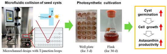 While this study identified optimal flow rates and loop numbers for promoting cell growth, there remains significant potential for further refinement of microfluidic parameters, including cell load, cell alignment efficacy, T-junction design, and channel geometry [40]. Fine-tuning these aspects, along with optimizing photosynthetic culture conditions, such as light intensity, CO2 concentration, and nutrient availability, could further improve astaxanthin productivity [59]. Scaling up the microfluidic collision process for industrial applications will require the development of high-throughput systems capable of efficiently processing large volumes of microalgal cultures [33,60]. Furthermore, exploring the broader application of microfluidic collision treatment beyond H. lacustris could open new opportunities. Given the versatility of this technique, it may be applicable to other microalgal species or even different types of organisms with similar cyst or spore-forming life cycles [61,62,63]. Expanding the scope of this research could establish microfluidic collision as a universal tool for enhancing the productivity of a wide range of bioactive compounds.
