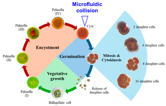 Life cycle of Haematococcus lacustris, illustrating the three distinct cell stages during photosynthetic cultivation: cyst germination, vegetative growth, and encystment. Various cell morphologies, including cysts, germinating cells, released daughter cells, biflagellate cells, and palmella types (I–V), were observed by light microscopy. During germination, a cyst cell undergoes repeated mitotic events and cytokinesis to produce daughter cells, eventually releasing motile cells. In this study, microfluidic collision treatment was applied to H. lacustris cysts to break dormancy and enhance subsequent photosynthetic cell growth.