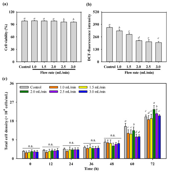 Effect of microfluidic flow rate on (a) cell viability and (b) reactive oxygen species levels in Haematococcus lacustris cysts. (c) Time course profile of total cell number density for 72 h of photosynthetic well plate cultivation using cysts treated at different microfluidic flow rates (1.0, 1.5, 2.0, 2.5, and 3.0 mL/min). Error bars represent the mean and standard deviation of three independent experiments (n = 6). Different italicized letters (a–e) indicate the significance of the differences (p < 0.05). DCF: 2′,7′-dichlorofluorescein. n.s. denotes non-significance between the groups.