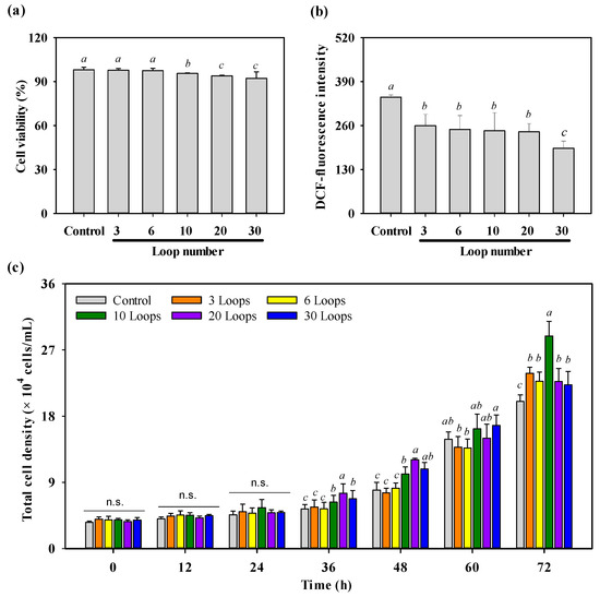 Effect of microfluidic loop number on (a) cell viability and (b) reactive oxygen species levels in Haematococcus lacustris cysts. (c) Time course profile of total cell number density for 72 h of photosynthetic well plate cultivation using cysts treated with varying loop numbers (3, 6, 10, 20, and 30). Error bars represent the mean and standard deviation of three independent experiments (n = 6). Different italicized letters (a, b, ab, and c) indicate the significance of the differences (p < 0.05). DCF: 2′,7′-dichlorofluorescein. n.s. denotes non-significance between the groups.