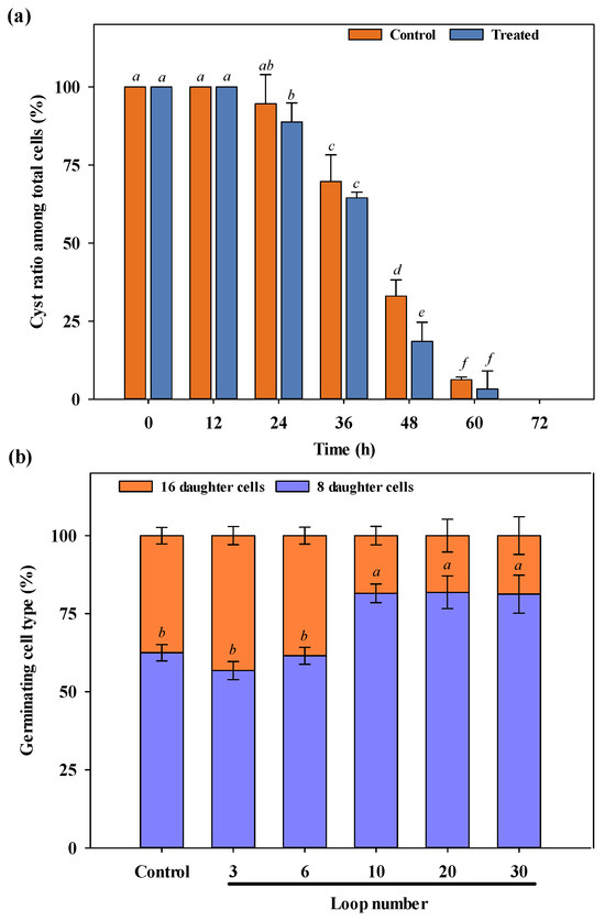 (a) Time course profile of the cyst cell ratio relative to total cell count during 72 h of photosynthetic well plate cultivation of Haematococcus lacustris using cysts treated with the optimal microfluidic treatment conditions (10 loops at 2.0 mL/min). (b) Ratio of germinating cell types producing 8 and 16 daughter cells after 48 h of well plate incubation with cysts treated at different microfluidic loop numbers (3, 6, 10, 20, and 30). Refer to Figure 2 for representative microscopic images of germinating cells. Each sample includes at least 100 randomly selected cells from three independent experiments (n = 6). Different italicized letters (a, ab, b, c, d, e, and f) indicate the significance of the differences (p < 0.01). n.s. denotes non-significance between the groups.