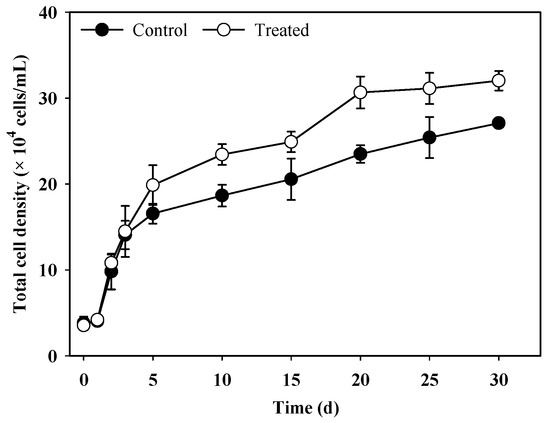 Figure 6 shows the time course profiles of total cell number density during photosynthetic flask cultivation. During the initial 3 days, microfluidic collision treatment resulted in a modest increase of 3–10% in cell density compared to the controls. This increase became more significant after 5 d, with treated cultures achieving an 18–30% higher cell density than controls. By the end of the 30 d flask cultivation, the treated H. lacustris cultures reached a total cell density of 32.0 ± 1.1 × 104 cells/mL, an 18.2% increase over the control (27.1 ± 0.3 × 104 cells/mL). While this increase was smaller than the 44.5% observed in the 3 d well plate cultures (Figure 4c), this discrepancy likely reflects differences in photosynthetic culture conditions—such as light transfer, CO2 supply, nutrient mixing, and shear stress—between well plate and flask cultures [55]. Despite these variations, the results from Figure 3c, Figure 4c and Figure 6 consistently demonstrate the positive impact of microfluidic collision treatment on the photosynthetic cell growth of H. lacustris across different culture systems.
