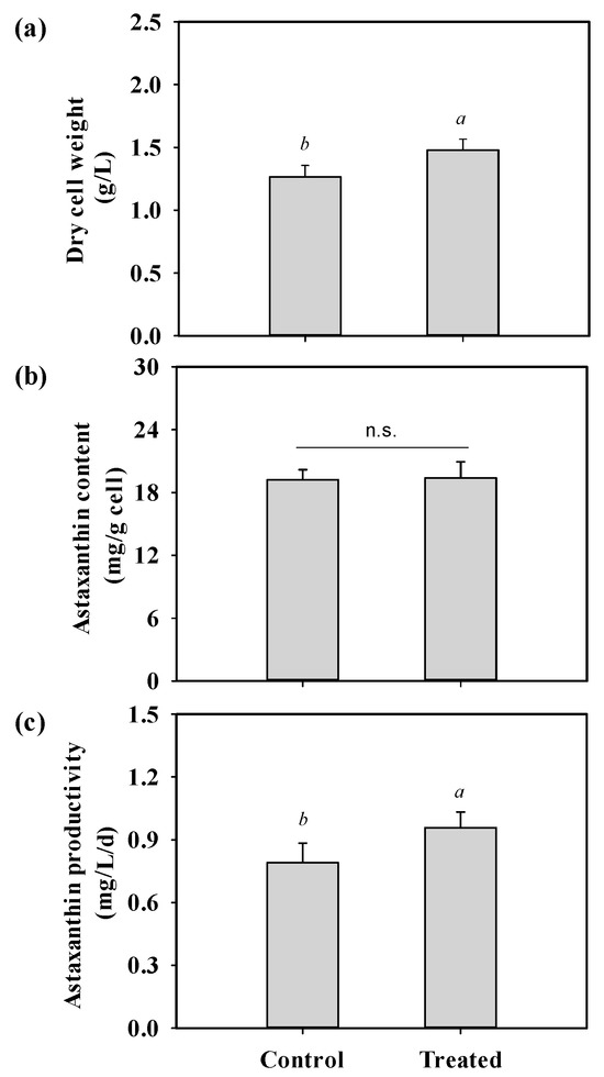 Comparison of (a) dry cell weight, (b) astaxanthin content, and (c) astaxanthin productivity after 30 d of photosynthetic flask cultivation of Haematococcus lacustris cysts with and without microfluidic collision treatment (10 loops at 2.0 mL/min). Error bars represent the standard deviations of three independent experiments (n = 6). Different italicized letters (a and b) indicate the significance of the differences (p < 0.05). n.s. denotes non-significance between the groups.