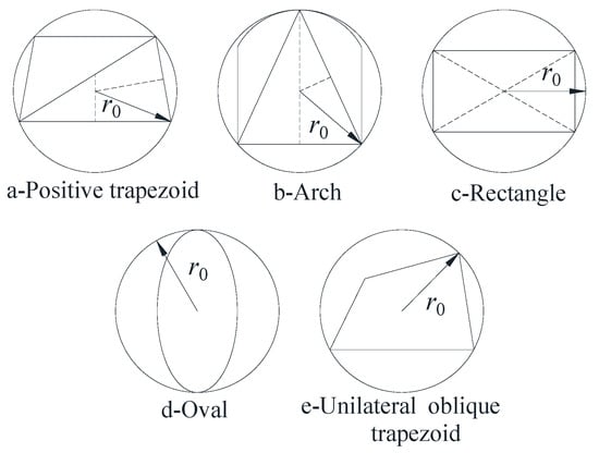 The irregular section’s circumscribed circle is constructed, and its radius is used to represent the virtual radius of the actual section. This virtual radius can be obtained via geometric graphing or analytical calculation, as shown in Figure 1.