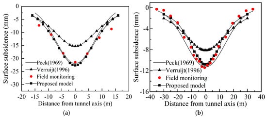 Figure 3 highlights the surface settlement curves for several cases. From the figure, it can be seen that there is no significant difference in curve shape and deformation pattern between the modified parameters in this paper and Sagaseta’s [42] relational formula for computing soil displacement, with only minor numerical discrepancies. The comparison reveals that incorporating ε and δ from Sagaseta [42] into the Verruijt [21] formula typically yields a soil displacement smaller than the measured value. At the maximum difference, the calculated value is only 71.46% of the measured maximum settlement. The adjusted parameter values align more closely with actual measurements, indicating that the corrected soil displacement for non-circular chamber excavation in semi-infinite space is applicable in the step method. Based on these results, the improved analytical solution and Peck formula [48] show good predictability for tunnel excavation-induced surface subsidence. However, the Peck formula [48] oversimplifies the influence of tunnel elliptical deformation on strata in later stages. The calculation method used in this study is slightly larger than the actual settlement, resulting in more conservative conclusions that ensure project safety.