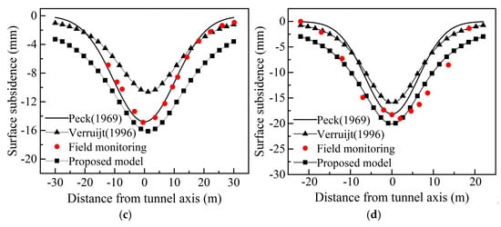 Surface settlement: (a) Case 1, (b) Case 2, (c) Case 3, and (d) Case 4 [21,48].