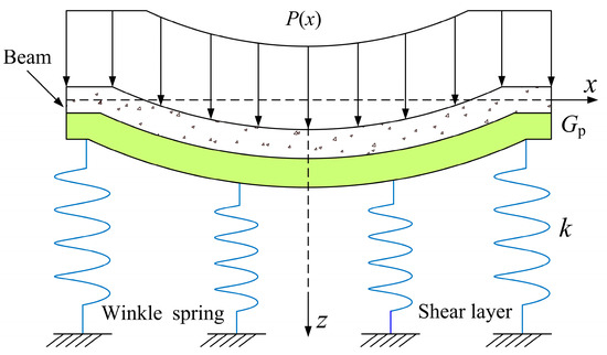 where EI represents the flexural stiffness of the extant structure, E is the elastic modulus of the existing structure, I represents the moment of inertia of the section of the existing structure, q(x) denotes the additional load applied to the beam, Gp indicates the foundation shear stiffness, k is the foundation spring stiffness, ω is the deflection of the beam, and b is the beam cross-section width.