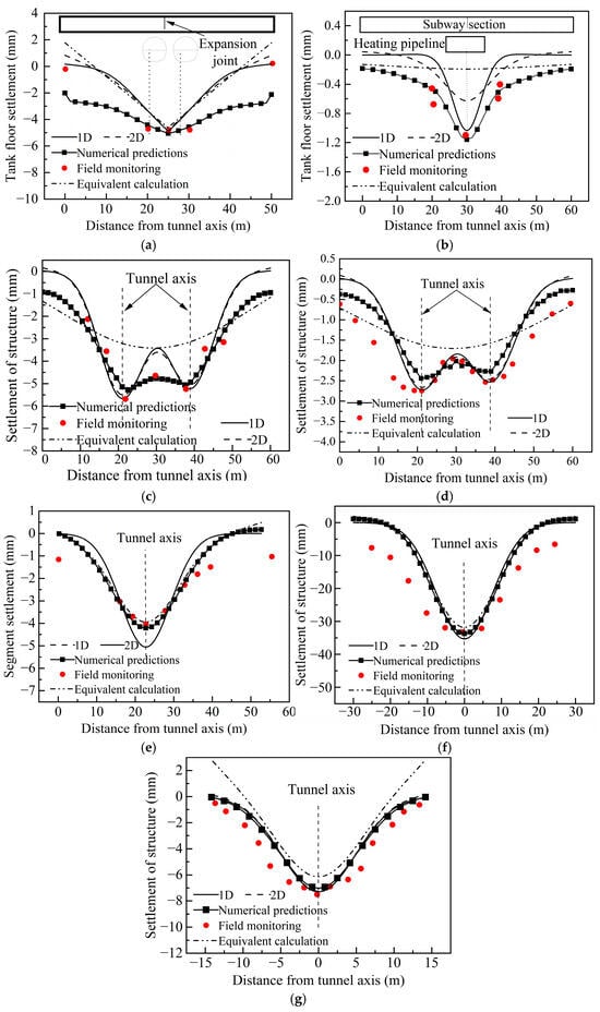 Comparison of deformation of existing structures: (a) Project 1, (b) Project 2, (c) Project 3, (d) Project 4, (e) Project 5, (f) Project 6, and (g) Project 7.