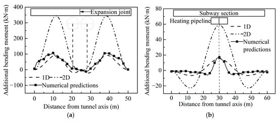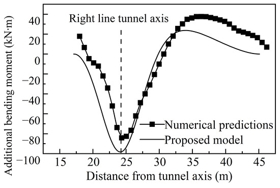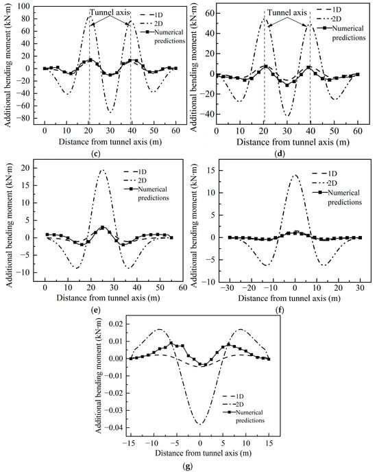 Figure 7 depicts the comparison of additional bending moments in various existing structures. In this figure, a positive bending moment signifies tension on the lower side, while a negative bending moment indicates tension on the upper side. Due to the excessively large overall equivalent stiffness of the structure, the calculated additional bending moment of the existing structure is excessively large and is therefore not analyzed here. Observing the figure, it is evident that, in terms of curve trend or additional bending moment value, the results of the 1D equivalent foundation beam align closely with numerical simulation outcomes. When using a 2D equivalent foundation beam, the additional bending moment value is several times that of the 1D. This implies that, when analyzing new tunnels crossing box or hollow tubular structures using elastic foundation beams, the calculation can be approximated by considering the thickness of the box structure’s bottom plate or, one time, the wall thickness of the structure, equivalent to a foundation beam of unit width.