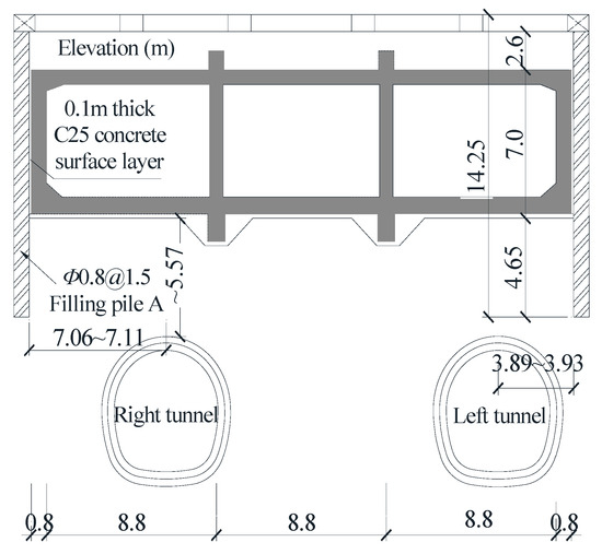 The Silk Belt Park—Ligeng Road interval lies within the CBD of Jinan. The cut-and-cover tunnel in this interval sits beneath a single-layer concrete frame structure. Retaining piles, reserved for open excavation, flank the existing structure on both sides, with a diameter of 0.8 m and a length of 14.25 m. The tunnel vault stands roughly 2.22 m to 8.18 m away from the existing structure floor, and a minimum horizontal clearance of about 3.9 m separates the tunnel vault from the retaining pile.