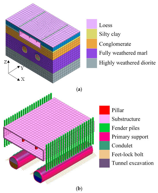 Figure 9b depicts the model of the existing structure. The roof and floor of the underpass, along with the tunnel’s initial support, are simulated using slab elements. The envelope piles, columns, and grid steel frames are simulated using beam elements. The lock-foot bolt and lead conduit are simulated using implantable trusses. The interface unit emulates the relative movement or separation between the envelope pile, steel grid frame, and solid unit. For beam, plate, column, pile, and lock anchor, the linear elastic model is adopted.
