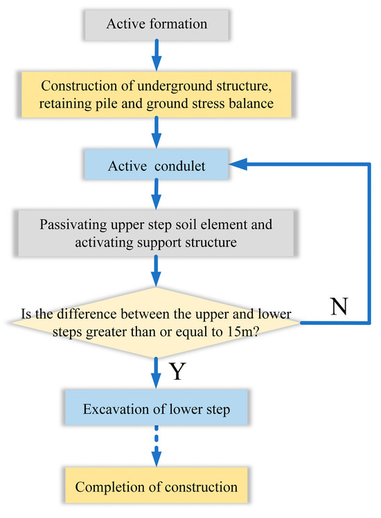In the actual construction process, the excavation footage for each ring of the upper step varies from 2.2 m to 3.0 m, while that of the lower step is approximately 5.0 m. Consequently, during the simulation, the upper step is excavated in increments of 2.25 m each time. When the spacing between the excavation faces of the upper and lower steps reaches 15 m, the lower step is excavated in increments of 6.75 m. Considering that the underground structure and surrounding soil have consolidated due to self-weight in practical engineering, tunnel construction is deemed to be the primary cause of soil disturbance. The construction sequence of the hidden tunnel is depicted in Figure 10.