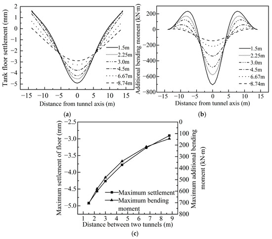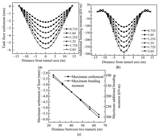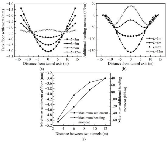 The clear distance between the newly built tunnel and the floor: (a) floor settlement curve, (b) variation curve of additional bending moment of floor, and (c) influence of tunnel spacing L on Smax and Mmax.