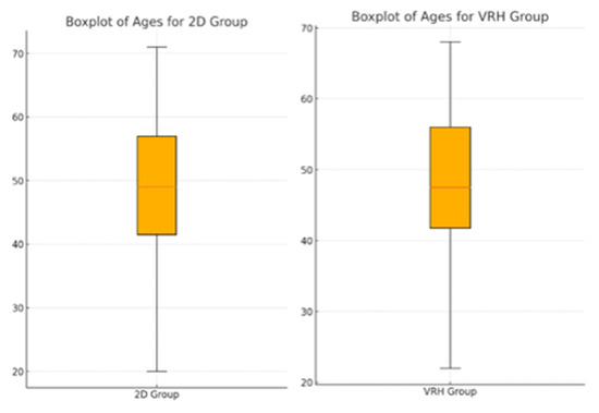 Figure 1. The boxplots of ages for the VRH group and 2D group.