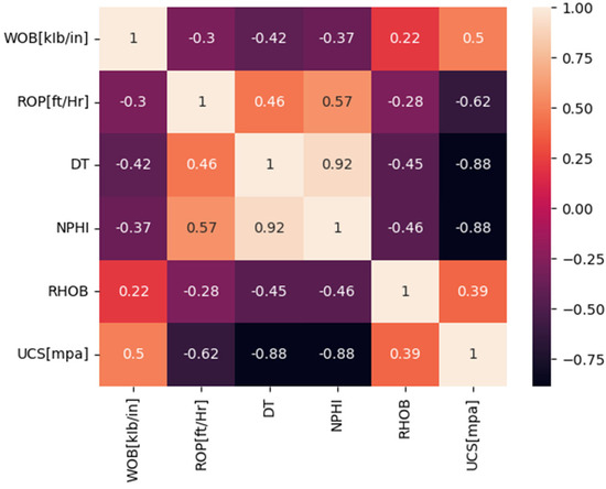 Correlation heatmap between UCS and the input parameters.