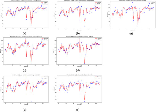 Comparison between the predicted values of each model and the actual UCS values versus the data index for the training dataset. (a) Linear Regression, (b) Random Forest, (c) Gradient Boosting, (d) XGBoost, (e) LightGBM, (f) SVM-SVR, and (g) MLP-ANN.