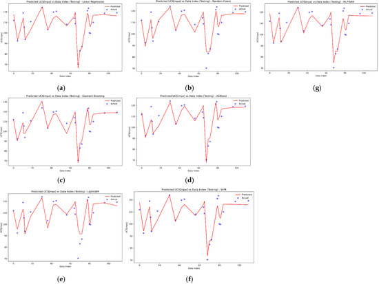 Comparison between the predicted values of each model and the actual UCS values versus the data index for the testing dataset. (a) Linear Regression, (b) Random Forest, (c) Gradient Boosting, (d) XGBoost, (e) LightGBM, (f) SVM-SVR, and (g) MLP-ANN.